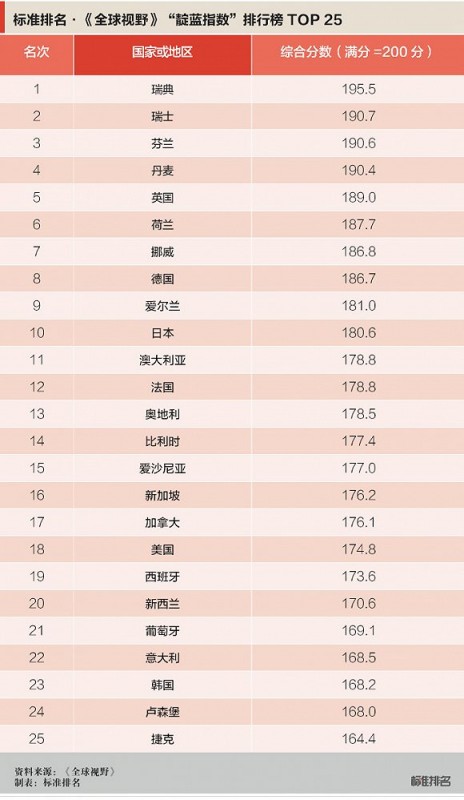 丹麦、英国、荷兰、挪威、德国、爱尔兰和日本依次排在第四至第十位。