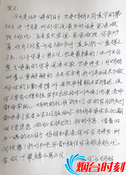 “宝贝,今天是四年一遇的日子,也是妈妈上岗值守的第34天。这一月来,听到你说最多的话是‘爸爸做饭不好吃’,后来有次你说,爸爸做饭,你来炒菜,这句话不知为何一直在我心里挥之不去,你是小男子汉!这对只会煮方便面的你来说是收获,也是进步!可妈妈听着心里酸酸的,今年你中考,我们本应该尽力做好你的后勤保障工作,虽然疫情期开学推迟,但你不要有心理负担,学校已经给你们开通了网课,老师都非常用心,妈妈的抗‘疫’战友们、你的学习战友们都送了经验给你,妈妈希望你在此期间不要焦虑,做好学习规划,按时作息。借着四年一遇的好日子,妈妈和爸爸祝你学习进步,所向披靡!”这是刘翠芳在“备考妈妈”群里发出的一封写给儿子的信。